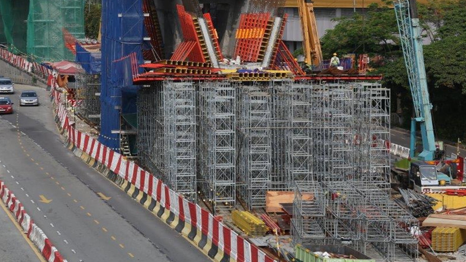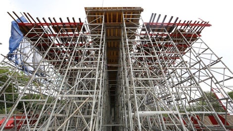 Support construction using standard parts. This ensured a safe transfer of loads during the building of the superstructure.
